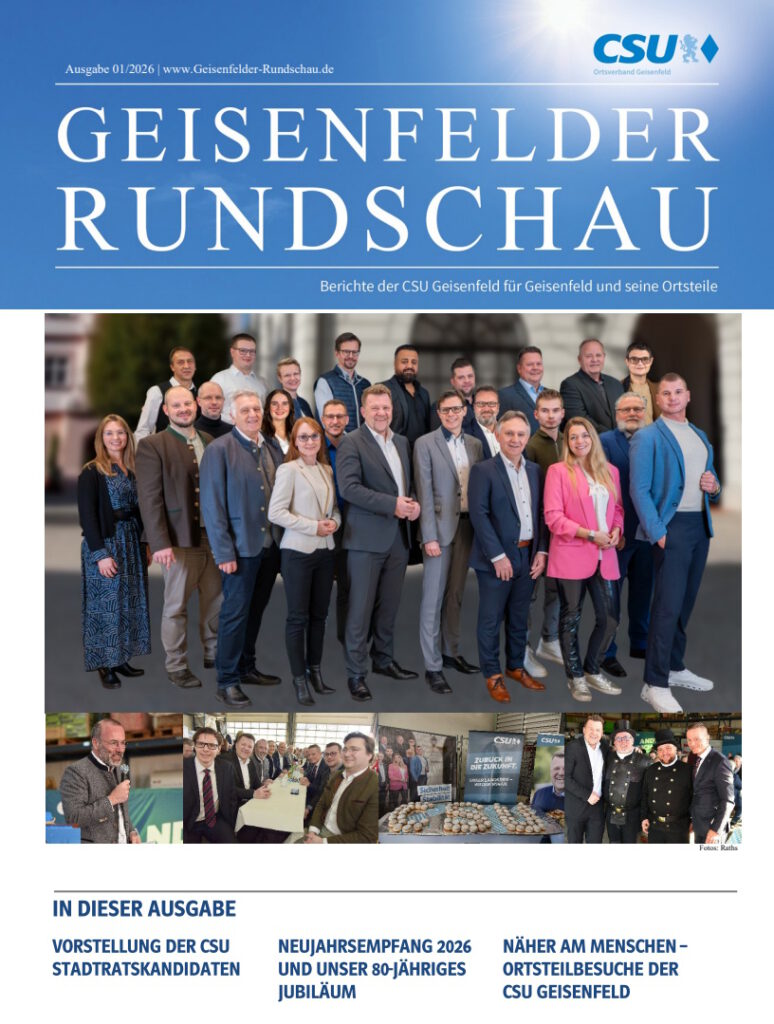 Stadtrat im Wandel – die neue Rundschau zeigt die Richtung der CSU! In der aktuellen Ausgabe erwartet Euch das persönliche Grußwort unseres Landratskandidaten Andreas Aichele sowie die Vorstellung unserer Stadtratskandidaten. Außerdem blicken wir zurück auf den Neujahrsempfang mit 80‑jährigen Jubiläum der CSU Geisenfeld mit Ehrengast Manfred Weber, MdEP, und auf den offiziellen Start in den Wahlkampf bei unserer Aufstellungsversammlung.