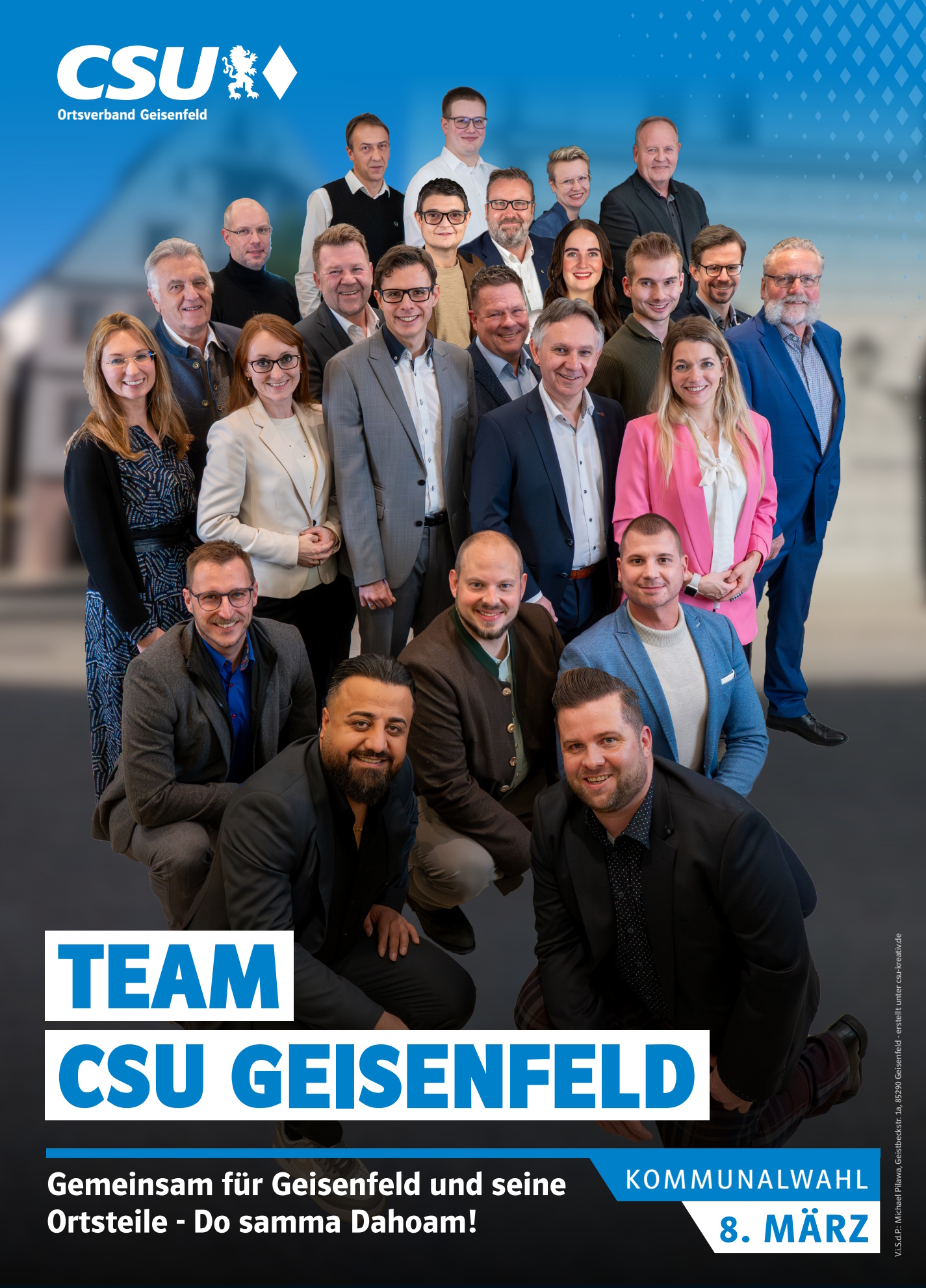 Mit 24 engagierten Stadtratskandidaten übernehmen wir Verantwortung und gestalten die Zukunft Geisenfelds! Gemeinsam, geschlossen und entschlossen – das ist das Team CSU-Geisenfeld.
